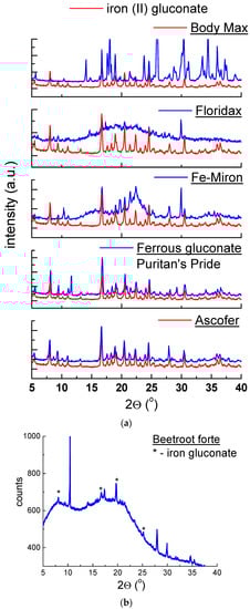 Diffraction patterns for dietary supplements: (a) Ascofer, Ferrous gluconate Puritan’s Pride, Fe-Miron, Floridax, Body Max and (b) Beetroot forte.