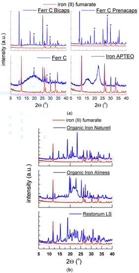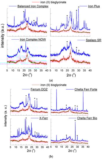 Diffraction patterns for dietary supplements: (a) Ferr C Bicaps, Ferr C Prenacaps, Ferr C, Iron APTEO, (b) Restonum LS, Organic Iron Naturell, Organic Iron Aliness, *—vitamin C.