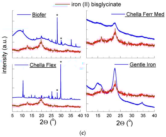 Diffraction patterns for dietary supplements: (a) Balanced Iron Complex, Iron Plus, Iron Complex Now, Szelazo SR, (b) Ferrum DOZ, Chella Ferr Forte, X-Ferr, Chella Ferr Bio, (c) Biofer, Chella Ferr Med, Chella Flex, Gentle Iron, *—vitamin C.