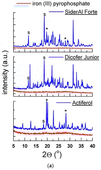 Diffraction pattern for dietary supplements: (a) SiderAl Folic, Dicofer Junior, Actiferol, (b) SiderAl Folic, SmartHit IV Ferrum, (c) Iron citrate Swanson, s—sorbitol, t—TiO2, *—vitamin C.