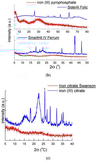It was only possible to identify the diffraction lines from the crystalline substances present in these supplements (Figure 6a–c). Diffractograms of tested dietary supplements showed diffraction lines derived from other components, for example, sorbitol, vitamin C, cellulose or TiO2. The lines visible for the diffraction pattern of dietary supplements with iron (III) pyrophosphate, derived from sorbitol, were lined with the PDF 00-039-1923 card, while those with the vitamin C were lined with the PDF 00-004-0308 card. On the diffraction pattern for dietary supplements: Iron citrate Swanson, the widened line between 20–25° of 2θ indicates cellulose. The strongest diffraction line (2θ = 25.61°) confirmed the TiO2 presence (Figure 6c). A similar phenomenon, confirming cellulose’s presence, is observed for other dietary supplements, for example, Iron APTEO, Ferr C, Restonum LS or Organic Iron Aliness.