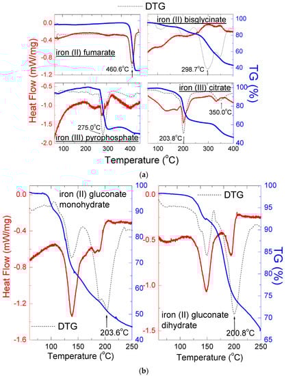 DSC and TG/DTG curves of pure iron compounds: iron (II) fumarate, iron (III) pyrophosphate, iron (II) bisglycinate and iron (III) citrate (a) and for iron (II) gluconate monohydrate and iron (II) gluconate dihydrate (b).