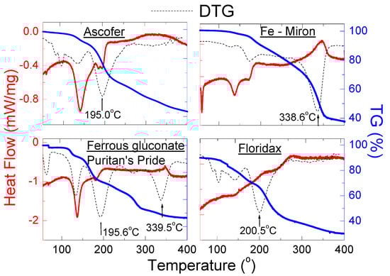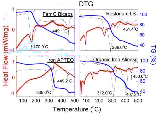 Thermal measurements using DSC/TG (DSC—Differential Scanning Calorimetry, TG—Thermogravimetry) were carried out for pure iron compounds and 21 selected dietary supplements. The technical details of these measurements are described in [27]. The remaining samples of dietary supplements exploded during the measurement and posed a threat to the equipment. The DSC/TG data are presented in Table 5, Table 6, Table 7, Table 8 and Table 9, while only the temperatures connected with DTG maximum are shown in figures. On the TG curve, steps related to the change in mass during heating or cooling could be observed. These steps are often blurred and may overlap when several reactions occur in a sample in succession. A DTG curve can be generated based on the TG curve, making it easier to distinguish overlapping thermal effects and accurately determine each reaction’s start and end temperature associated with a mass change.