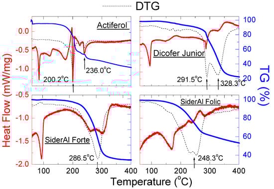 DSC and TG/DTG curves of dietary supplements containing iron (III) pyrophosphate: Actiferol, Dicofer Junior, SiderAl Folic and SiderAl Forte.