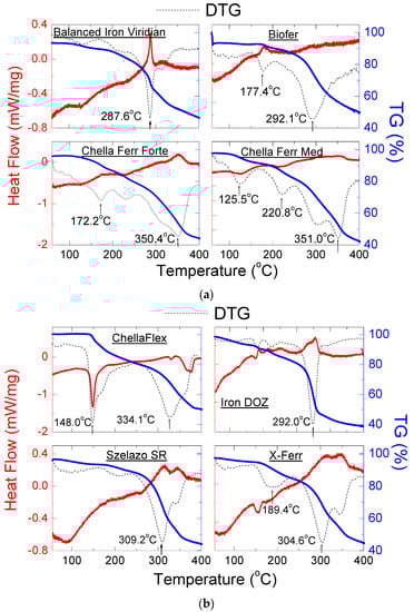 Figure 7a,b show results of thermal analysis of pure iron compounds present in dietary supplements. Table 5 presents thermal parameters for the examined iron compounds obtained by DSC/TG.