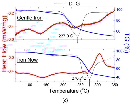 The dietary supplements containing iron (II) bisglycinate: Balanced Iron Viridian, Biofer, Chella Ferr Forte, Chella Ferr Med, Chella Flex, Ferrum DOZ, Szelazo SR, X-Ferr, Gentle Iron and Iron NOW have been measured using DSC/TG method. The results are presented in Figure 11a–c, and in Table 9.