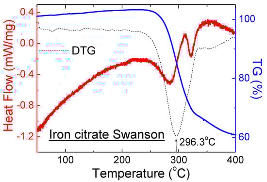 Similarly, the melting point of iron (III) citrate is not found in the literature. Still, our measurements showed the presence of two endothermic peaks, the first at 201.9 °C, and the second at 332.2 °C. DTG curve indicate that the decomposition of this sample took place in two stages, the fastest at 203.2 °C. For iron (II) bisglycinate, the endothermic peaks were not observed on the DSC curve (Figure 7b). However, the TG/DTG curves indicate the process of decomposition, which takes place in several steps.