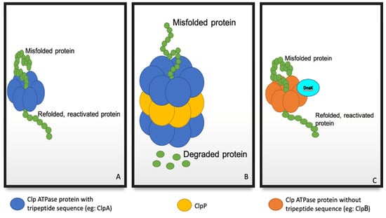 To maintain protein homeostasis under stressful conditions, misfolded proteins are recruited via regulatory subunits, unfolded, and reactivated using energy generated from ATP hydrolysis (Figure 1A) [,]. Proteins which are not successfully reactivated are then translocated into ClpP for degradation (Figure 1B) [,]. Certain ATPase regulatory subunits, such as ClpB, lack the tripeptide required for ClpP interaction, and therefore reactivate aggregated proteins through the assistance of chaperone systems such as the DnaK system (Figure 1C) [].