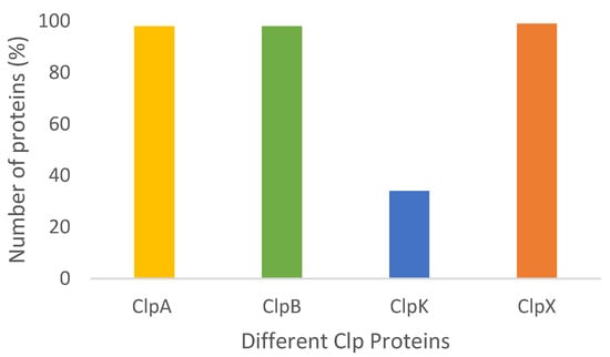 Our data shows a considerably low number of ClpK identified among the Klebsiella strains compared to the number of ClpA, ClpB and ClpX proteins. Out of the 57 K. pneumoniae strains which were analyzed, only 27 (47%) contained ClpK (Figure 2 and Figure 3). This was unexpected because ClpK is reported to be ubiquitous and is found in various species such as Escherichia coli, Enterobacter cloacae, and other Klebsiella strains other than Klebsiella pneumoniae []. Also, taking into account that the clpk gene is hypothesized to be transferred through horizontal gene transfer, one would expect it to be present among a greater number of the investigated strains []. However, the absence of ClpK in a majority of the studied strains may indicate the selective uptake of the clpk gene by pathogens to enable them to survive its current harsh environment. Our findings are similar to those obtained by Bojer, et al. (2010), wherein they reported that only 31 out of the 105 clinical isolates contained the clpk gene, suggesting that only certain strains acquired the plasmid through horizontal transfer to subsequently express the ClpK protein []. Interestingly, we also observed that none of the studied species contained ClpC. This observation correlates with the findings of Miller et al. (2018), who suggested that ClpC is a common ancestorial protein of ClpK and ClpA. Therefore inferring that the investigated strains may have contained ClpC at some point, which have now mutated into either ClpA or ClpK depending on environmental conditions [].