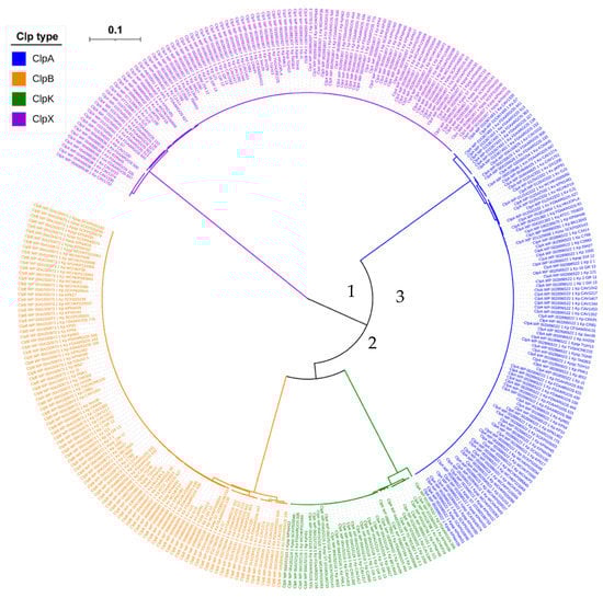 Phylogenetic tree of Clp proteins found among the seven Klebsiella species. MAFFT embedded in Trex servers was used to align the tree. Different Clp proteins are indicated in different colors. Centre of tree (1); point of ClpK and ClpB divergence (2); ClpA (3). Tree distance scale: 0.1.