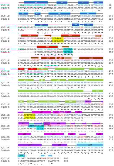 Alignment of ClpK with ClpB. The annotations were done according to sequence ClpB (1QVR-B). The α-helices and β-sheet are shown as rectangles and arrows, respectively. ClpK residues colored blue represent the position of the α-helices whereas red residues represent the position of the β-sheet. Asterisks (*) denote the identical residues, (:) represents sequence homologies, and (.) represents weak similarity. The five domains are shown as follows: N-terminal domain (blue); D1 large domain (red); D1 small domain (green); short linker region (grey); D2 large domain (pink); D2 small domain/C-terminal domain (cyan). The secondary structure elements are colored according to the domain. Walker A and Walker B motifs are highlighted yellow and cyan, respectively. The alignment was performed using T-COFFEE [].