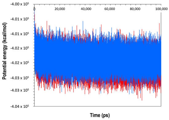 Potential energy profile of ClpK and ClpB during 100,000 ps molecular dynamic simulation. The potential energy for ClpK and ClpB is shown in red and blue, respectively. The image was generated using GraphPad prism.