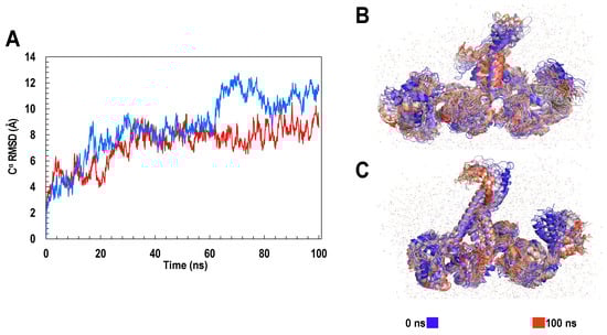 Trajectory analysis showing the RMSD values and the conformational changes of ClpK and ClpB over 100 ns. (A) RMSD values of ClpK and ClpB over 100 ns. The trajectory of ClpK is indicated in red and the trajectory of ClpB is indicated in blue. (B) Conformational changes of ClpB observed over 100 ns. (C) Conformational changes of ClpK observed over 100 ns.
