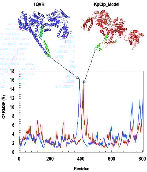 The RMSF of the ClpK and ClpB residues as a function of the 800 ns simulation time. ClpK is represented as red and ClpB is represented as blue on the graph and structures. The positions of the peaks are represented on the ClpK and ClpB structures in green. The highest peak for ClpK is seen around residues 410 to 425, while the highest peak for ClpB is seen around residues 379 to 407. To assess the regions of flexibility, we add 110 and 4 to the region values obtained for ClpK and ClpB, respectively, as the structures have been modelled from residue 110 and 4. The graph was generated using Excel. The 3D protein structures were generated using PyMOL.