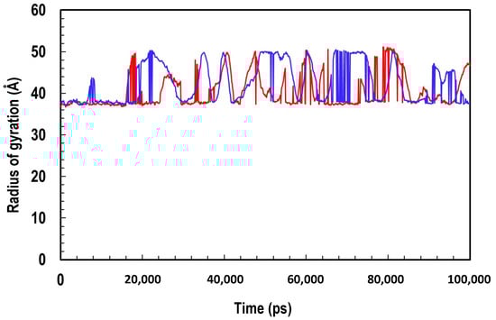 Trajectory analysis showing the Radius of gyration of the Cα of ClpK over 100,000 ps. ClpK is represented as red, and ClpB is represented as blue.