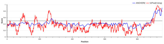 Protein disorder prediction for ClpK. The ClpK protein sequence (Figure S4) was analysed using the IUPred2A server for the presence of ordered and/or disordered regions. The black line represents the threshold; the red line represents the protein disorder prediction (IUPred2A), and the blue line represents the binding disorder prediction (Anchor2).