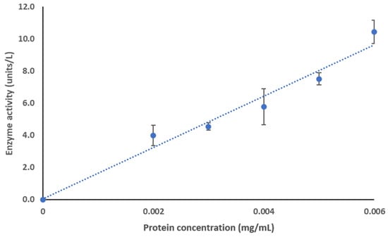 ClpK has been identified as an ATPase since it consists of structural motifs associated with the hydrolysis of ATP [,,,]. To our knowledge, the ability of ClpK to hydrolyse ATP in vitro has not been reported to date. Therefore, we tested the biological activity of the purified protein using an ATPase assay. Figure 15 shows the ATPase activity of ClpK. Enzyme activity increases from 0 ± 0 units/L to 10.43 ± 0.72 units/L as protein concentration increases from 0 mg/mL to 0.006 mg/mL, therefore indicating that ATP hydrolysis is concentration dependent (Figure 15).