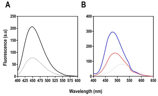 Tertiary structure analysis was carried out using extrinsic fluorescence spectroscopy based on mant-ATP and ANS fluorescence (Figure 17). Both mant- and ANS are fluorophores that alter their spectral properties depending on the polarity of their environment [,]. When mant and ANS bind within a hydrophobic pocket in a protein, an increase in quantum yield with a concomitant maximum emission wavelength (λmax) is observed [,]. This degree of shift in λmax often depends on the degree of hydrophobicity of the environment [,].