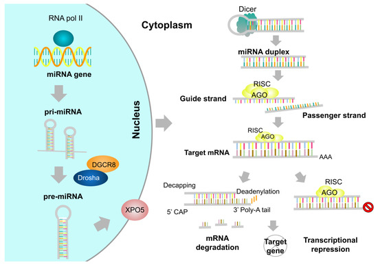 MicroRNAs (miRNAs) are small (20–24 nucleotides), non-coding RNA molecules that can modulate gene expression in eukaryotic organisms post-transcriptionally [5]. The existence of miRNAs was first reported (1993) in the nematode Caenorhabditis elegans and later in other relevant organisms, including Homo sapiens (humans), Mus musculus (mice), Arabidopsis thaliana, and Drosophila melanogaster [6,7]. The biogenesis process of miRNAs begins when long primary miRNAs (pri-miRNAs) are transcribed in the nucleus by RNA polymerase II. Afterward, the Drosha complex (conformed by Drosha RNase II, DGCR8, and other associated proteins) processes these pri-miRNAs into hairpin structures known as precursor miRNAs (pre-miRNAs). Once Drosha-mediated processing has been completed, pre-miRNAs are transported to the cytoplasm by exportin-5 (XPO5), where the Dicer RNase III, with the support of Dicer-associated proteins, interacts with the pre-miRNAs to produce mature miRNA duplexes [8]. Subsequently, one of the strands of the miRNA duplex, known as the guide strand, generates the RNA-induced silencing complex (RISC) with an argonaute (AGO) protein and other important polypeptides. Finally, the RISC interacts with its complementary mRNA target and regulates its expression (Figure 1).