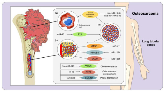 Xu et al. [73] unveiled that the expression of miR-411 was significantly higher in serum samples obtained from osteosarcoma patients than that of healthy subjects. Additionally, miR-411 was found to be upregulated in osteosarcoma tissues. Subsequently, researchers observed that the overexpression of miR-411 stimulates both osteosarcoma cell migration and proliferation via reducing the expression of metastasis suppressor protein 1 (MTSS1). Therefore, the inhibition of miR-411 could be a reliable method to treat osteosarcoma progression. Previous investigations have supported the fact that miR-1284 is linked with different types of cancer [74,75]. To explore the role of this regulatory molecule in osteosarcoma, tumor tissues were examined, and the outcomes of this analysis indicated that the expression of miR-1284 was lower in tumor tissues when compared to adjacent healthy tissues. Moreover, the expression of HMGB1 was considerably higher in tumor tissues, thus revealing that the expression of this protein might be negatively correlated with the occurrence of miR-1284. The main functions of HMGB1 are related to DNA-associated processes, including replication, translation, and repair; however, its role within osteosarcoma development may be related to the inhibition of osteosarcoma cell migration and proliferation [76]. Additionally, Hua et al. [77] noticed that the survival rate of osteosarcoma patients with an elevated expression of blood let-7a (negatively regulates the E2F2, a transcription factor involved in diverse cancer pathways) was higher than that of patients with inferior expression of let-7a, and hence this miRNA could be a potent biomarker for osteosarcoma.
