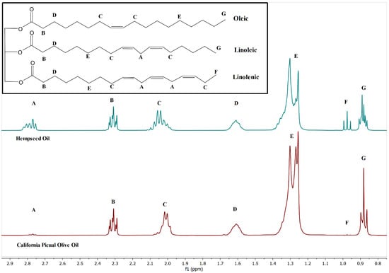 Multiplet “A” at 2.78 ppm (Figure 1) is due to the methylene protons positioned between two π-bonds in polyunsaturated fatty acids, such as linoleic and linolenic. Polyunsaturated fatty acids are plentiful in hempseed oil and are in relatively low abundance in olive oils as seen by the intensity difference of this feature in the two spectra [4].