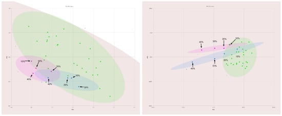 Comparison of PC1–PC2 plots of 400 MHz 1H NMR spectra of pure olive oils (green), safflower oil adulterated olive oil (magenta) and sunflower oil adulterated olive oil (blue) showing the differences between traditional normalization (left) and normalization to ω-3 fatty acids (right).