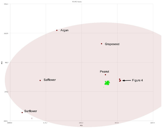 PC1–PC2 plot of 400 MHz 1H NMR spectra of seed oils (labeled) versus olive oils (green). Ellipses represent the 95% confidence interval. The congested region is expanded in Figure 4.