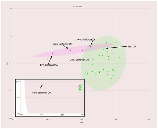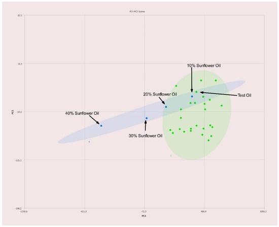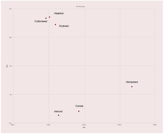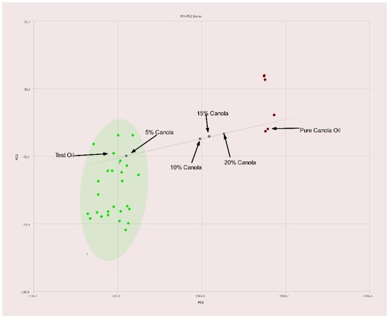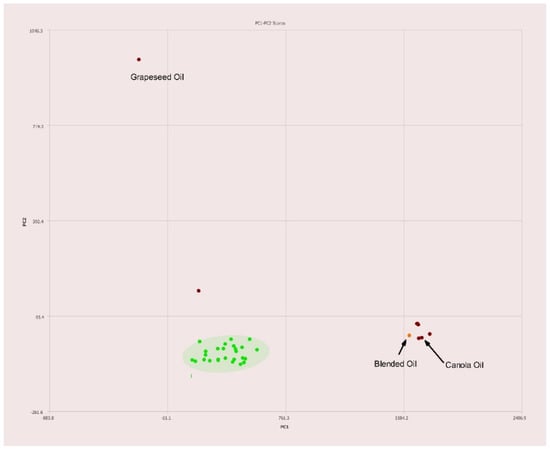 A commercially available blend of 70% canola, 20% grapeseed, and 10% olive oils was tested for the sake of comparison. As expected, the placement on the PC1–PC2 plot is nearest to canola oil with slight deviation toward both olive and grapeseed oils as seen in Figure 11.