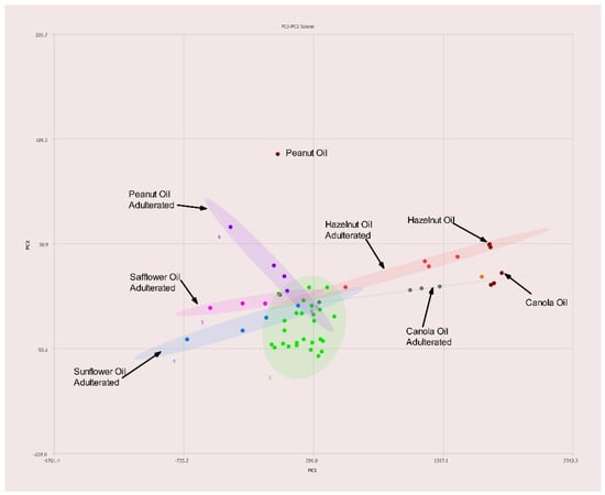 In Figure 5, the green dots represent the same olive oils shown in Figure 2. The extended ellipses represent olive oils samples that have been adulterated as described in the previous section. To the far right of the figure, the labeled maroon dots indicate the location of pure hazelnut oil (also indicated by an arrow in the figure). As the concentration of olive oil is increased the red dots show how the samples moved towards the pure olive oil region (green). Four other oils were used to dilute olive oil. In each case, the undiluted sample (pure olive oil) resides in the green region. As the concentration of the adulterant oil increases, the ellipses move towards the respective oil used to dilute the olive oil (peanut, safflower, sunflower, or canola oil). Due to the greater degree of separation, particularly in the case of high-oleic canola, safflower, and sunflower oils, this allows for identification of the adulterant oil.