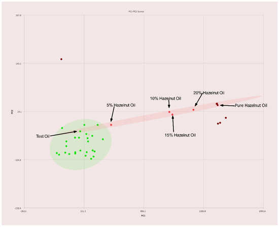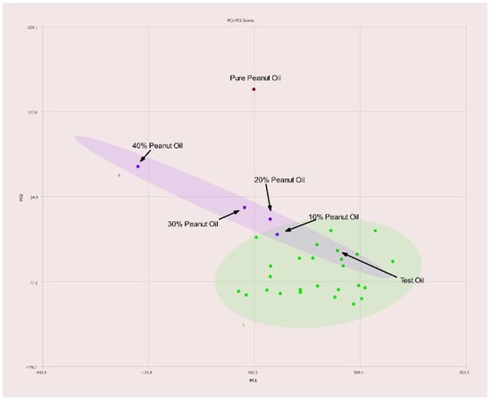 PC1–PC2 plot of 400 MHz 1H NMR spectra of a commercially available blended oil composed of 70% canola, 20% grapeseed, and 10% olive oils (v/v). Ellipses represent the 95% confidence interval.