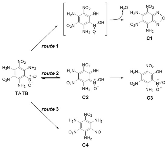 By browsing previous research, two plausible chemical process were proposed via a precursor to form the mono-benzofurazan derivative of TATB: (1) the formation of a biradical [11] and (2) nitro↔aci-nitro tautomerism [14]. The formation of a biradical mediated by intramolecular hydrogen transfer from the -NH2 to the -NO2 group has been suggested as a precursor to decomposition products such as benzofurazans with an activation barrier calculated to be 47.5 kcal/mol [15]. Free radical formation detected by EPR during UV-induced degradation of TATB has also been reported [7]. Although the formation of the aci-nitro isomer of TATB requires a relatively low energy of 42.1 kcal/mol, subsequent cyclization by removing water to produce mono-benzofurazan requires an overall activating barrier of 68.6 kcal/mol [14], which is much higher than that calculated for the biradical process, 47.5 kcal/mol [15]; this suggests that the precursor of the mono-benzofurazan derivative of TATB (C1) is rather a biradical during photolysis by simulated sunlight (Scheme 1, route 1).