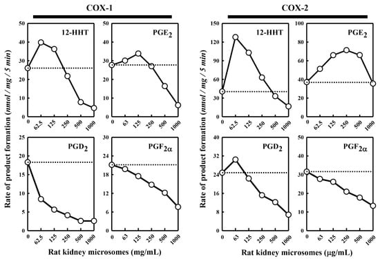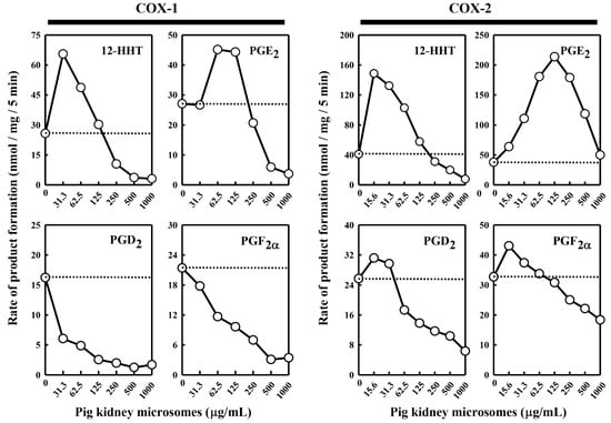 In the case of COX-2-mediated reactions, addition of the pig kidney microsomes at protein concentrations below 125 μg/mL produced a concentration-dependent stimulation of PGE