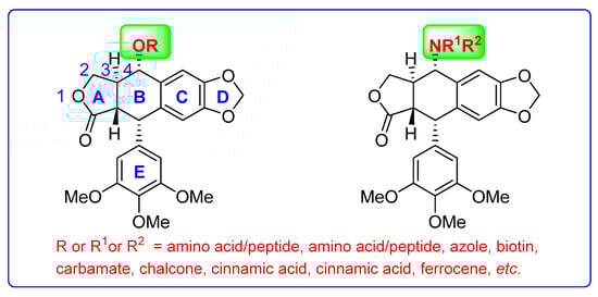 Depending on the chosen modern molecule hybridization strategy [,], podophyllotoxin/epipodophyllotoxin can hybridize with amino acid/peptide [,], azole [], biotin [], carbamate [], chalcone [], cinnamic acid [], cinnamic acid [], ferrocene [], furan/pyrrole [], hydroxamic acid [], indole [], norcantharidin [], pyridine/pyrimidine [], pterostilbene [], retinoic acid [], sugar [], (thio)urea [], or sulfur [] (Figure 1). These have been subjected to extensive research and have been shown to be highly active against both MDR and drug-sensitive cancer cell lines with IC50 or GI50 values at a nanomolar level; however, the water solubility, bioactivities, and toxicity still need to be improved. Analogs on a large scale, for drug discovery and application, are still required.
