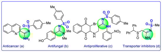 On the other hand, the N-sulfonyl amidine moiety frequently appears in biologically active compounds, and has displayed a crucial role in medicinal chemistry research, where it has therapeutic effects against several diseases. It showed a prolific set of biological activities (Figure 2), including anticancer (a) [], antifungal (b) [], antiresorptive (c) [], dopamine transporter inhibition (d) [], and antiproliferative activities [], etc.
