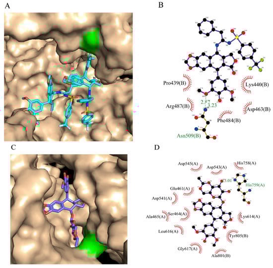 In order to check the affinity of topoisomerase-II and PSAH 5c, docking results are shown in Figure 1, where the docking score of both is −8.9 kcal/mol. From Figure 4A, we are able to see the binding mode and conformation of 5c at the target. The green residue (ASN-509) has hydrogen bond interaction with 5c. The detailed interaction force can be seen from Figure 4B. Asn-509 has hydrogen bond interaction with ligand with bond lengths of 3.23 and 2.87. Pro-439, ARG-487, PHE484, ASP463, and LYS-440 formed hydrophobic interactions. The positive control compound Etoposide (−8.3 kcal/mol), which forms hydrogen bond interactions with residue His-759, and forms hydrophobic interactions with Gln-461, Ser-464, and Ala-465. After comparison, it can be found that the binding effect of the selected compound 5c is better than that of the positive compound.