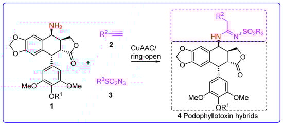Accordingly, herein we describe a new series of podophyllotoxin-N-sulfonyl amidine hybrids (PSAH) with potent antiproliferative activity. The operationally simple synthesis protocol involved stirring a mixture of the terminal alkynes, sulfonyl azides, and podophyllotoxin in the presence of a copper (I) catalyst; additionally, we studied the effects of different functional groups on cytotoxicity (Scheme 1).