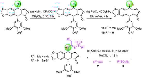 The key reaction in the synthesis of this class of compounds was the copper-catalyzed sulfonyl azide–alkyne cycloaddition/ring cleavage (CuAAC/ring-opening reaction) [], which has been applied to synthesize numerous oxygen-containing and nitrogen-containing heterocyclic compounds []. As show in Scheme 2, podophyllotoxins 1a and 1b were easily prepared by the substrate podophyllotoxin nucleophilic substitution and reduction with NaN3. Initially, podophyllotoxin (1a or 1b) was dissolved in MeCN; then, corresponding terminal alkynes (2a–2m, see Supplemetary Materials Scheme S2) and sulfonyl azides (3a–3j, see Supplemetary Materials Scheme S3) were added with stirring. The reaction mixture was stirred for about 12 h to afford podophyllotoxin-N-sulfonyl amidine hybrids (4a–4v and 5a–5f) in good–excellent yields (Table 1). This reaction appears quite flexible and offers an easy capacity to generate a large scale PSAH with mild condition, operability, and highly atom economical. The chemical structures of all synthesized compounds were determined by 1H NMR, 13C NMR, IR, and HRMS.