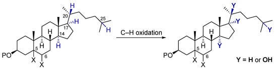 There have already been many reports on the chemical synthesis of oxysterols from commercially available (but sometimes expensive) steroidal molecules. From the viewpoint of the preparation of a wide variety of oxysterols, however, catalyst-driven C–H oxidation of cholesterol or its derivatives is an attractive strategy [11]. For example, Barton and co-workers showed in 1985 that direct oxidation of 3β,5α,6β-triacetoxycholestane by use of the Gif system (iron cluster-metallic zinc-pyridine-acetic acid-oxygen) provided a variety of oxidized cholestanes, most of which were ketone derivatives generated by oxidation of the methylene group in the cholestane skeleton [12]. On the other hand, two of the present authors (Doiuchi and Uchida) recently developed an Ru (bpga)-catalyzed C–H oxidation reaction with high tertiary C–H bond selectivity and an excellent catalyst turnover number (TON = 26,000 in oxidation of adamantane) [13,14]. We envisioned that Ru (bpga)-catalyzed C–H oxidation of protected cholesterol would afford a variety of hydroxycholesterols via the oxidation of tertiary C–H (C25, C20, C17, and C14); these are not formed by oxidation using the Gif system (Figure 1). Here, we report the synthesis and separation/purification of a series of oxysterols obtained in this way, together with their NMR spectra (500 MHz) and the results of crystallographic analysis.