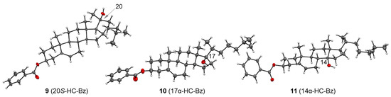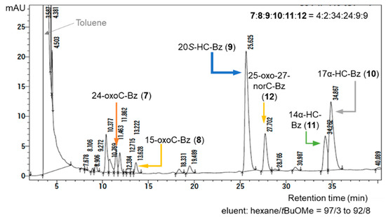 The mono-oxidized derivatives were roughly divided into four parts by SiO2 column chromatography (Figure 2). The most polar fraction on TLC (Fr 21–23) afforded Bz-protected 25-HC (6, 25-HC-Bz) as a single product (26%, 36% brsm). HPLC analysis of Fr 10–13 showed multiple peaks (see Supplementary Materials) due to a mixture of products, among which we identified the 24-oxo derivative (7, 24-oxoC-Bz). Fr 14–15 contained four compounds, which were separated by HPLC (see Supplementary Materials) and characterized as 20S-HC-Bz (9), 17α-HC-Bz (10), 14α-HC-Bz (11), and a small amount of 25-oxo-27-norC-Bz (12). The stereochemistry of 9–11 was confirmed by X-ray crystallographic analysis, showing that the C–H oxidation reaction was stereo-retentive (Figure 3). Compounds 9, 10, and 12 were also isolated from Fr 16–20, indicating high tertiary C–H selectivity of the Ru(Bpga) catalyst. HPLC analysis of the mono-oxidized derivatives showed a product ratio of 7:8:9:10:11:12 = 4:2:34:24:9:9 (Figure 4).
