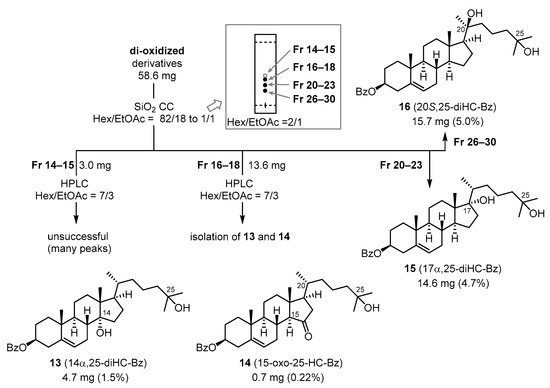 Similar separation procedures were applied to the di-oxidized derivatives (Figure 5). Although no material was isolated from Fr 14–15, Fr 16–18 contained 14α,25-diHC-Bz (13) and a trace amount of 15-oxo-25-HC-Bz (14), together with unidentified compounds. Fr 20–23 and Fr 26–30 contained almost pure 17α,25-diHC-Bz (15) and 20S,25-diHC-Bz (16), respectively. The stereochemistry of 13, 15, and 16 was confirmed by X-ray crystallographic analysis (Figure 6). The results suggested that a second C–H oxidation of the major product 25-HC-Bz (6) occurred in a highly tertiary C–H selective and stereo-retentive manner. Random oxidation is presumably suppressed to some extent by the high selectivity of the Ru(Bpga) catalyst, and this enabled the isolation of 10 D-ring or side-chain-oxidized cholesterol derivatives at once from only 400 mg of 5α,6β-dibromocholestane 2-Bz. HPLC analysis of the di-oxidized derivatives confirmed successful isolation of the major products in a ratio of 13:14:15:16 = 17:2:31:39 (Figure 7).