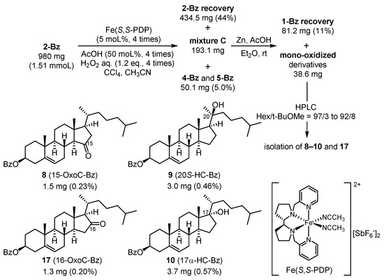 We also examined the C–H oxidation of 2-Bz with Fe (S,S-PDP) (White’s catalyst; Fe (S,S-PDP) = [Fe (S,S-PDP) (MeCN)2][SbF6]2; S,S-PDP = (2S,2′S)-1,1′-bis (pyridin-2-ylmethyl)-2,2′-bipyrrolidine) [22], which is one of the best tertiary-selective C–H oxidation catalysts available for late-stage functionalization (Figure 8) [23]. Reaction of 2-Bz under the reported optimum conditions with a slight modification (use of CCl4 as a co-solvent because of the low solubility of 2-Bz in CH3CN) resulted in low conversion of C–H oxidation. We added the Fe (S,S-PDP) catalyst, H2O2, and acetic acid four times in order to consume as much starting material as possible, but almost half of the 2-Bz was recovered (44%). 25-HC-Bz derivative 4-Bz (see Table 1) was formed as a major product (total 5.0%), as seen with the Ru(Bpga) catalyst. After reduction with Zn/AcOH, identification of minor isomers revealed, in addition to 15-oxoC-Bz (8, 0.23%), 20S-HC-Bz (9, 0.46%), and 17α-HC-Bz (10, 0.57%), that 16-oxoC-Bz (17) was formed in 0.20% yield (calculated yields). Recovered 1-Bz (11%) might be derived from 3-Bz generated in the C–H oxidation reaction and/or incomplete separation of 2-Bz prior to Zn-mediated reduction. Many minor and major products of this reaction could be isolated by HPLC, and 8:9:10:17 were obtained in a ratio of 4:6:7:3 (Figure 9). These results indicate that changing the catalyst has the potential to provide different oxidized cholesterols in a different ratio, although oxidation of cholesterol derivatives by Fe (S,S-PDP) was not efficient under the reported conditions.