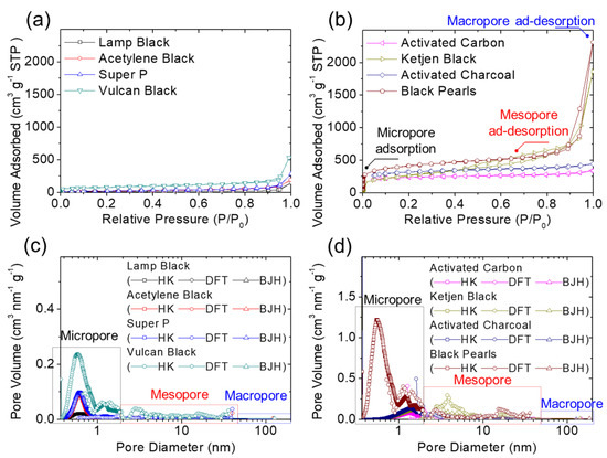Material characteristics: (a,b) nitrogen adsorption/desorption isotherms and (c,d) pore-size distributions of various carbon materials for the carbon-coated separators.