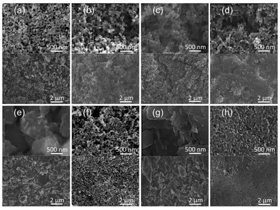 Material characteristics: scanning electron microscopy of (a) lamp black, (b) acetylene black, (c) Super P, (d) Vulcan black, (e) activated carbon, (f) Ketjen black, (g) activated charcoal, and (h) Black Pearls for the carbon-coated separators.