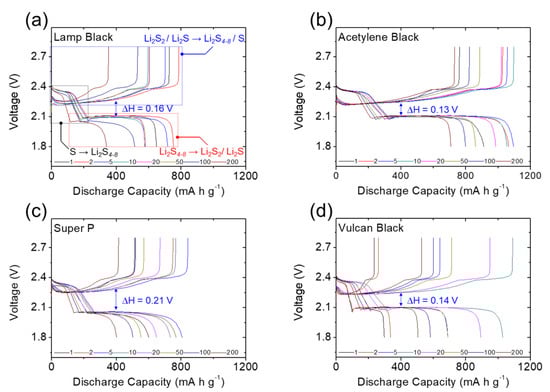 Electrochemical analysis: galvanostatic charge/discharge voltage profiles of the high-loading sulfur cathode in the lean-electrolyte cells with different carbon coating modules of (a) lamp black, (b) acetylene black, (c) Super P, and (d) Vulcan black.