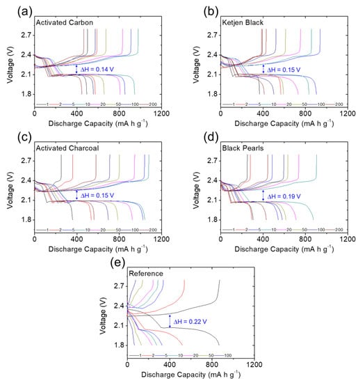 By considering the voltage hysteresis of the charge and discharge voltages, we determined the cell polarization attributable to the slow reaction kinetics and high electrode resistance caused by the high sulfur content in the cathode [13,14]. As shown in Figure 3 and Figure 4, the cells with the carbon-coated separators demonstrated stable and low polarization of 0.13–0.21 V during long-term cycling. The low polarization indicates that the carbon coatings would improve the charge transfer of high-loading sulfur cathodes, while maintaining steady lithium-ion transfer through the separator region (Figure 3 and Figure 4a–d). Among the carbon-coated separators, the module with the acetylene black coating had the lowest voltage hysteresis and the most stable charge/discharge curves, which demonstrate its outstanding electrochemical efficiency and stability. These results demonstrate the superior electrochemical performance of the high-loading sulfur cathode in the lean-electrolyte lithium–sulfur cell with the acetylene-black-coated separator. This implies that a nonporous carbon black coating with a low surface area and limited pore volume would be the most suitable coating material to boost cell performance, while avoiding the risk of absorbing too much liquid electrolyte from the coating layer (Figure 3b). By contrast, the reference cell faced increasing polarization during cycling, with the upper discharge plateau disappearing (Figure 4e). The increasing polarization may have been caused by redeposition of the diffusing polysulfides on the electrode, which would form an insulating solid-state material with no connection to the conductive network in the cathode [6,7,8,9].