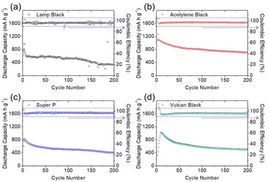 Electrochemical analysis: long-term cyclability of the high-loading sulfur cathode in the lean-electrolyte cells with different carbon coating modules of (a) lamp black, (b) acetylene black, (c) Super P, and (d) Vulcan black.