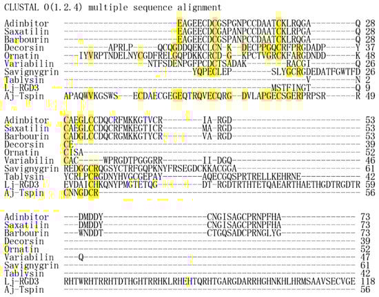 To date, disintegrins have mainly been found in five different species, including snakes [,,,], leeches [,], ticks [,], horseflies [,] and lampreys [,]. Based on acid sequence analysis, different disintegrins from snake venom show more than 60% sequence identities, while disintegrins from the five different species almost show no homology, except that the common characteristics are the RGD motif and several pairs of cysteines (Figure 3). Similarly, Aj-Tspin shows almost no homologue with the disintegrins from the above five species, as previously reported (Figure 3). Additionally, Aj-Tspin contains the RGD motif and several cysteines shared by disintegrin family members.