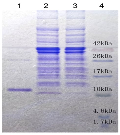 Subsequently, the PCR products of the third TSP1 domain of ADAMTS13-like from sea cucumber (A. japonicus), which was also named Aj-Tspin, were amplified through PCR, with the synthesized sequence as a template, and extracted through TaKaRa MiniBEST Plasmid Purification Kit Ver.4.0 (TaKaRa, Dalian, China) according to the manufacturer’s instructions. After ligating with pET23b, the recombinant plasmid (pET23b-Aj-Tspin) was transformed into Escherichia coli (E. coli) BL21 cells using the CaCl2 method []. Then, the positive bacteria with pET23b-Aj-Tspin were screened and identified through sequencing with T7 universal primers. Next, rAj-Tspin was expressed with the induction of 1 mM (final concentration) IPTG at 30 °C for 15 h. After centrifugation, the precipitate of the above bacteria was collected and put into an ultrasonicator on ice to obtain the crude proteins. Finally, rAj-Tspin was purified through affinity chromatography using a nickel column and analyzed by the Tricine SDS-PAGE []. Finally, the concentration of rAj-Tspin was measured through Coomassie Brilliant Blue (G250) assay.