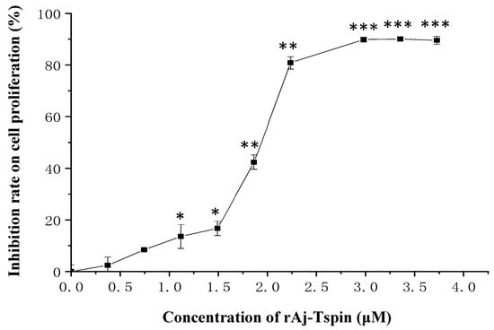 Here, the proliferation of LLC cells in the presence of rAj-Tspin was detected by CCK-8 assay. As shown in Figure 5, proliferation of LLC cells was inhibited by rAj-Tspin. As the dosage of rAj-Tspin (0.37, 0.75, 1.12, 1.49, 1.86, 2.24, 2.98, 3.35 and 3.73 μM) increased, the proliferation of LLC cells was suppressed evidently, indicating that the inhibition induced by rAj-Tspin was dose-dependent. Based on the calculation from the formula, the half maximal inhibitory concentration (IC50) of rAj-Tspin on the proliferation of LLC cells was 1.85 µM.