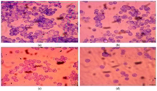 Wright-Giemsa staining assay detected the effect of rAj-Tspin on the morphology of LLC cells. The bar indicates 10 μm; (a) control; (b) 1.85 μM rAj-Tspin; (c) 2.20 μM rAj-Tspin; (d) 3.04 μM rAj-Tspin.